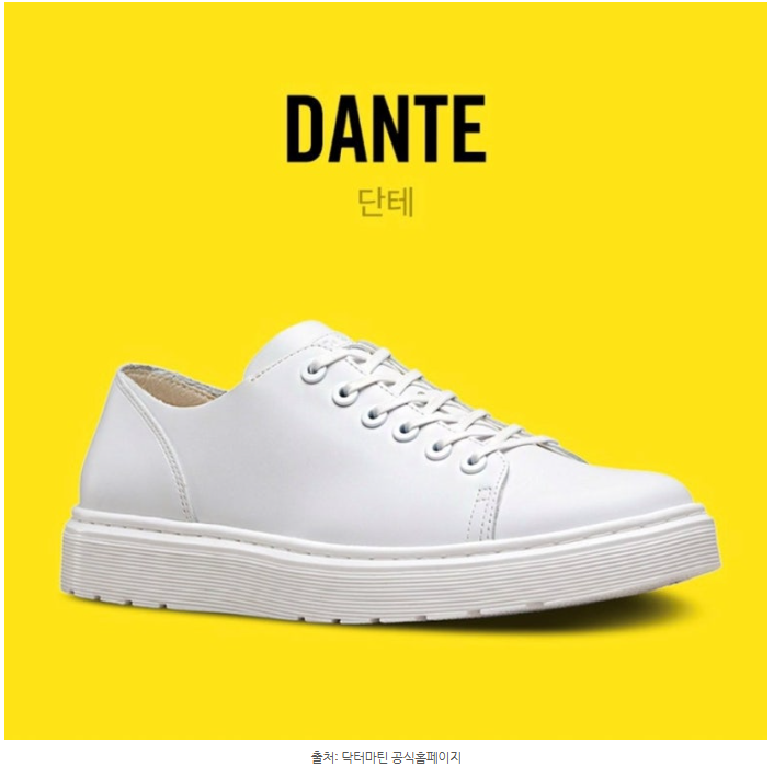 안녕하세요!오늘은 닥터마틴의 가성비 스니커즈 단테에 대해서 알아보려고 합니다.제가 한 때 즐겨 신었던 신발 중 하나로 애증이 많이 가는 신발이에요!   여름 하면 흰색 스니커즈 아닐까요?!데일리로 적합한 신발을 찾고 있던 중, 해당 신발이 눈에 띄더라구요.   "닥터마틴 단테 화이트 (6홀)"입니다.깔끔, 영롱 그 자체네요!​​닥터마틴 신발은 몇년 전, 슬립온 이후로 2번째로 구입해보네요.당시, 예쁘게 잘 신고 다녔던 추억이 있기에고민 없이 바로 질렀습니다.   구매는 온라인 몰에서 했습니다.백화점, ABC마트 등 다양한 루트가 있지만네이버 최저가가 짱인 것 같네요 ^.^  깔끔함의 끝판왕인 것 같아요.특별한 포인트가 없어서 단조로워보일 수도 있지만   신발 혀에 닥터마틴 로고와신발 굽은 닥터마틴의 시그..